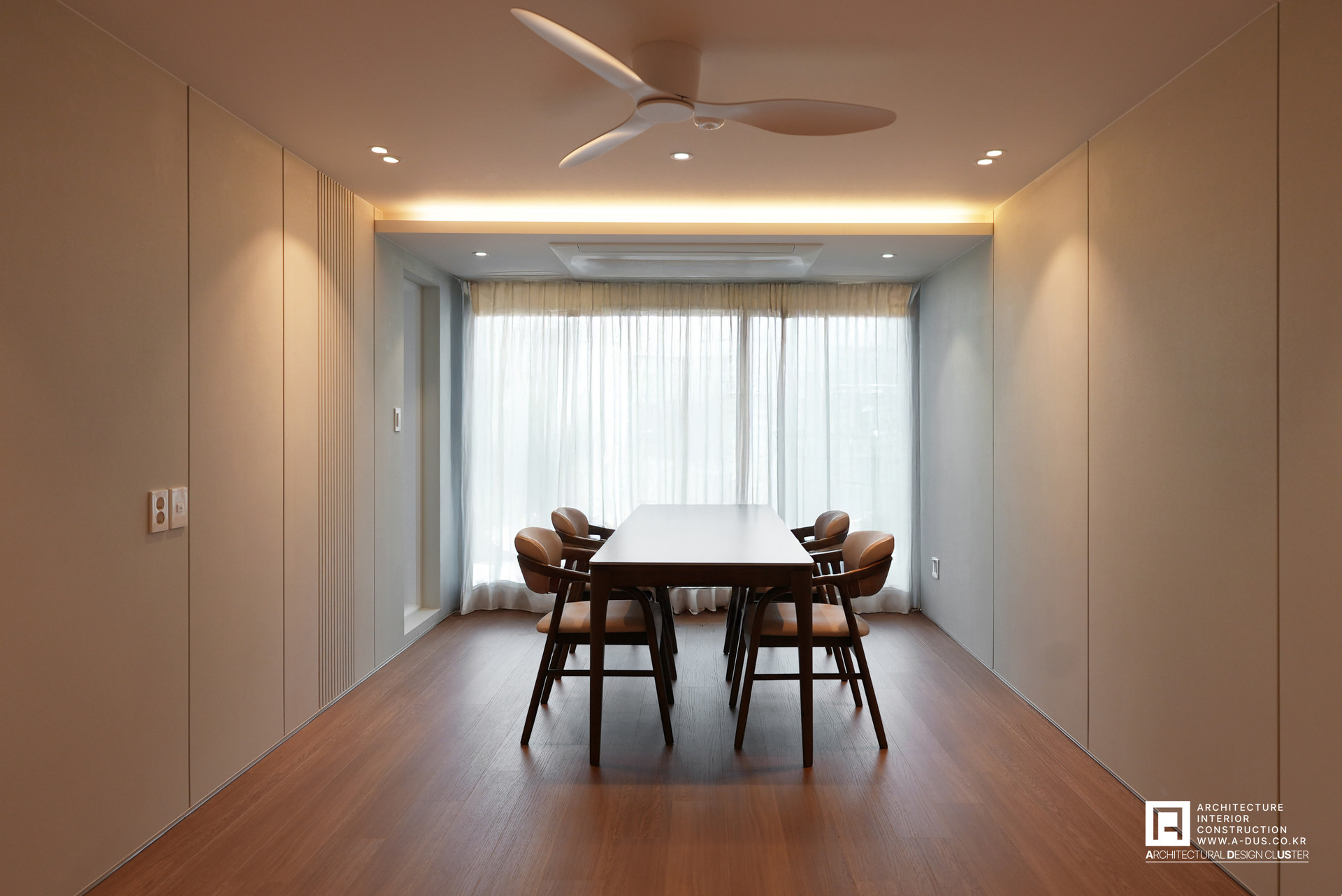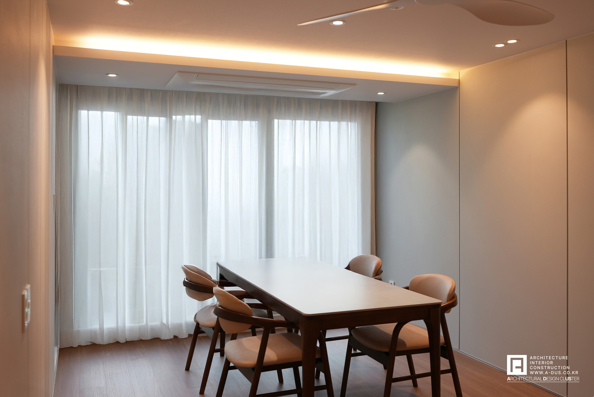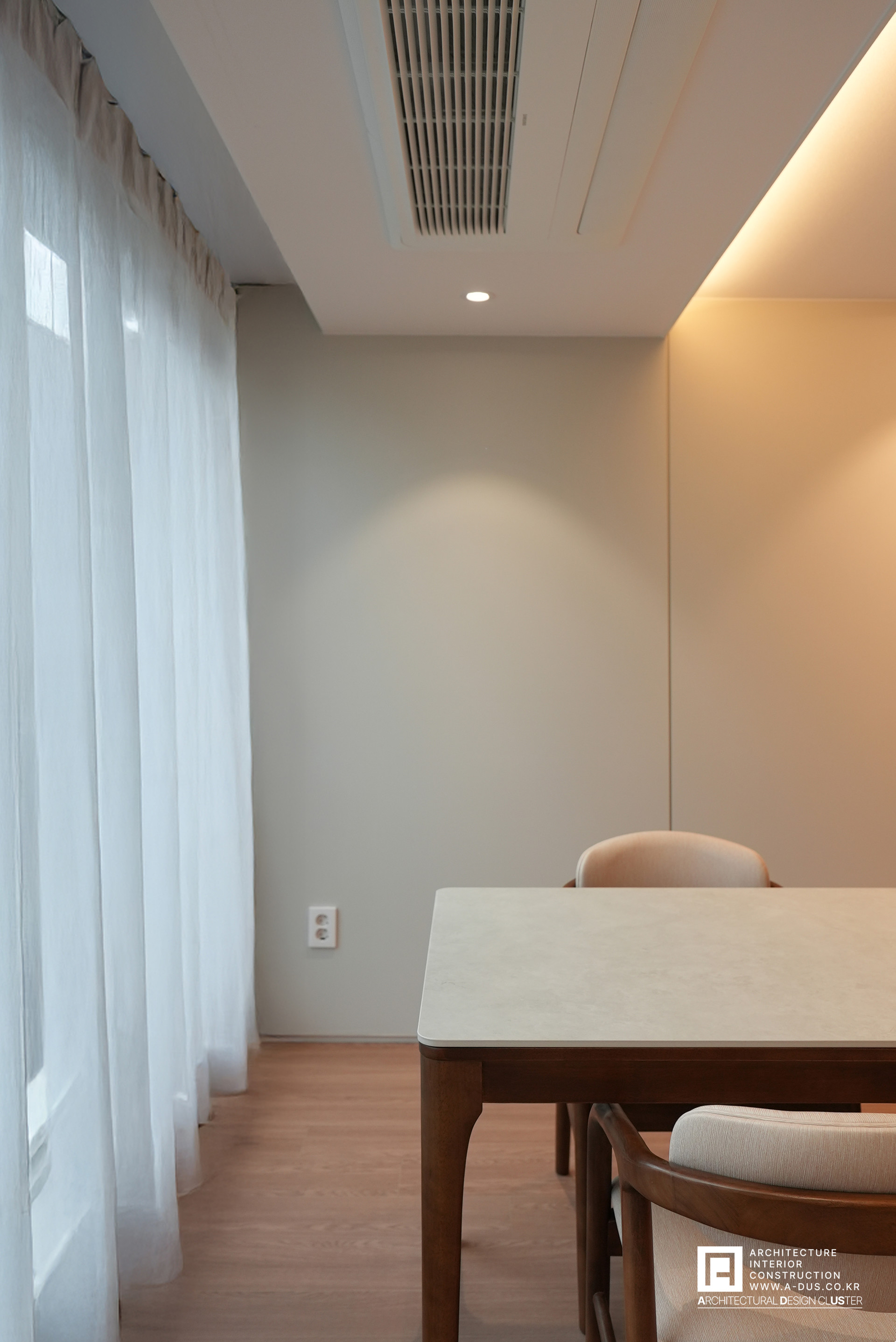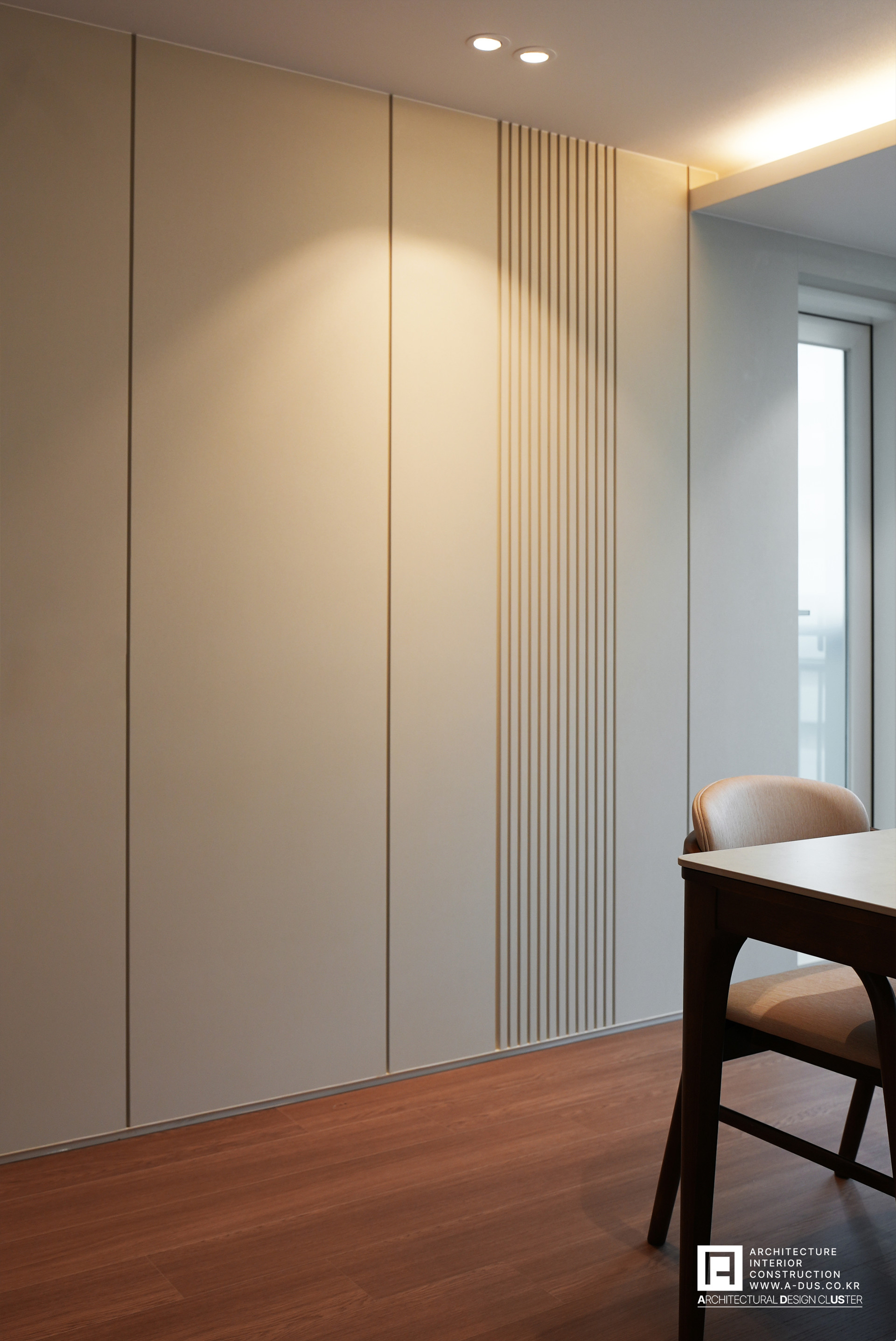 부부의 라이프스타일이 집약되는 거실은 따스한 질감의 마루와 웜그레이톤의 필름을 붙인 아트월로 아늑하면서도 편안한 분위기를 조성하였다. 포인트를 주는 벽면에는 랜덤한 라인패턴을 적용하여 시각적 포인트를 주고 반대편은 단정하고 절제된 라인으로 정리하여 전체적인 조형적 균형미를 완성하였다.