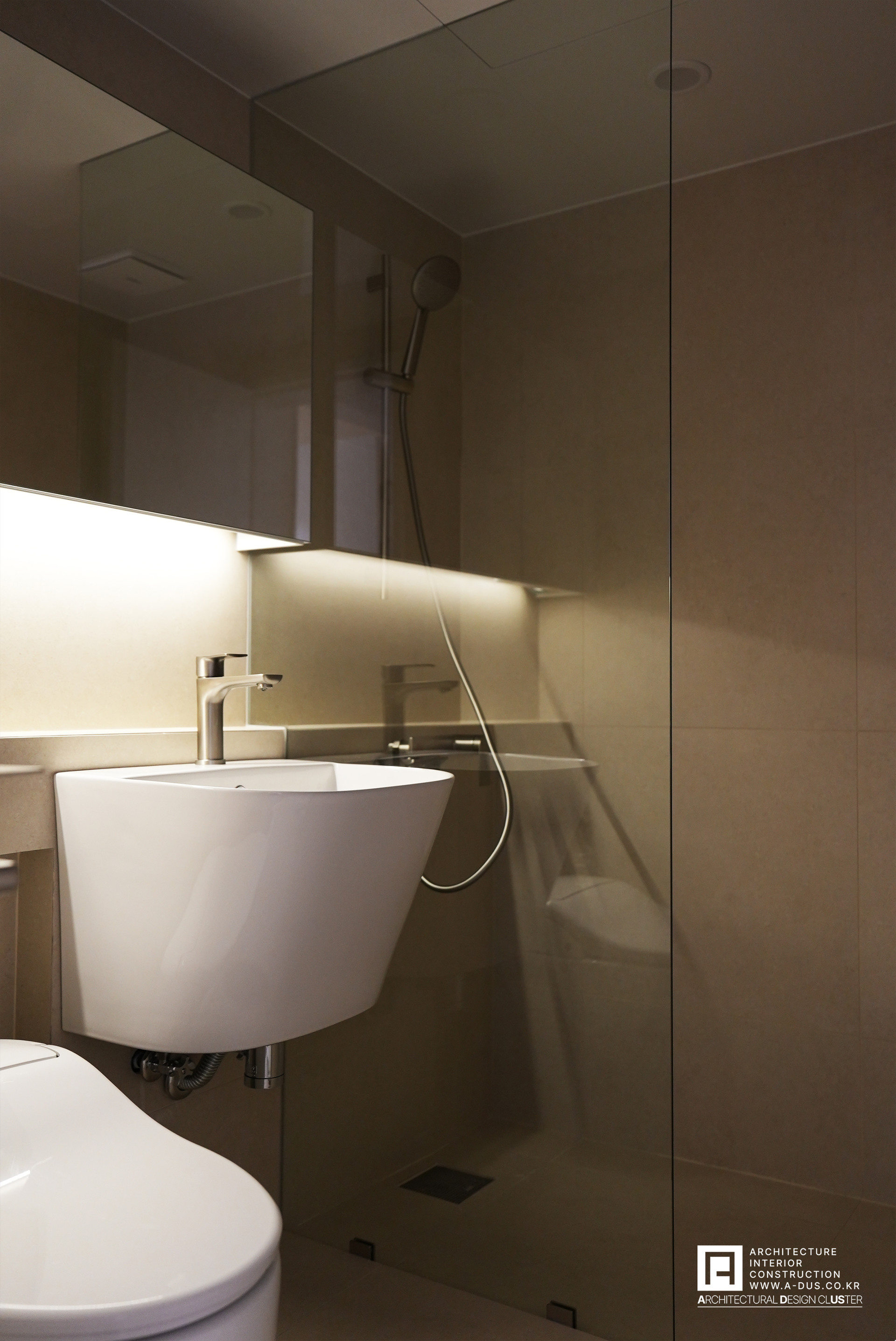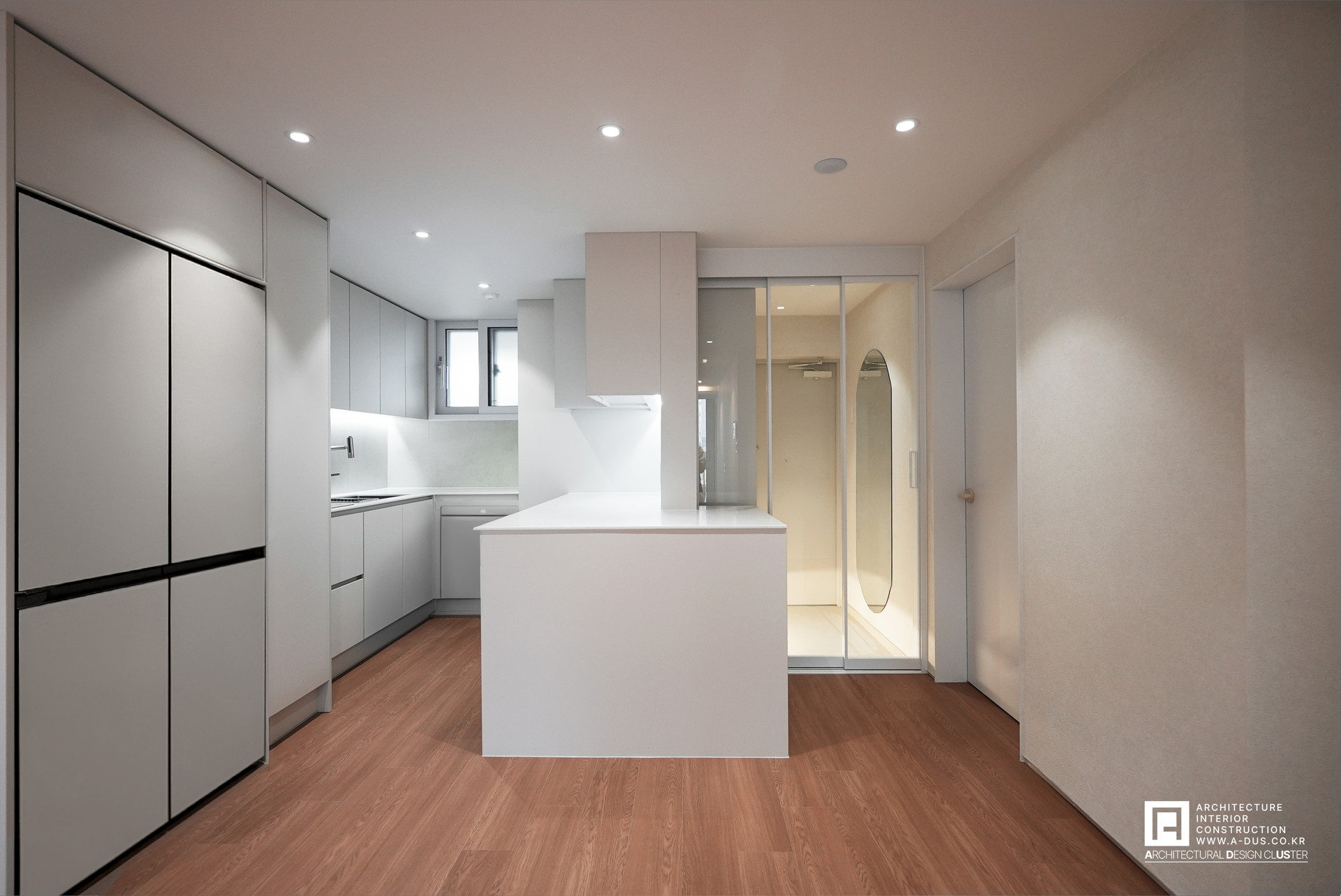 우선적으로 베란다를 확장하여 거실을 넓히고, 시스템 에어컨은 단내림으로 매립하여 천장을 깔끔히 정리하였다. 특히 조리공간을 좁게 만들고 공간을 단절시키던 주방 가벽을 철거하여, 작업대를 넓히는 동시에 주방에 매립되어 있던 세탁기도 베란다로 이전했다. 주방과 거실이 자연스럽게 이어지며 시각적 개방감을 확보함은 물론, 동선의 효율성까지 세심하게 고려하였다.